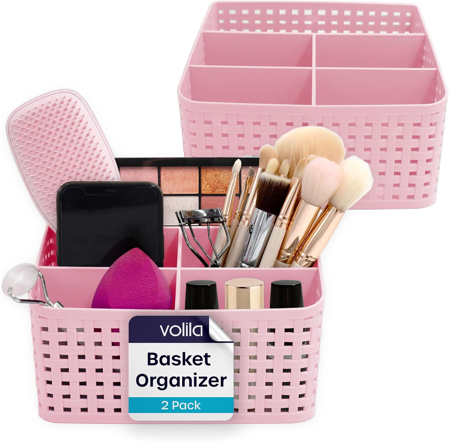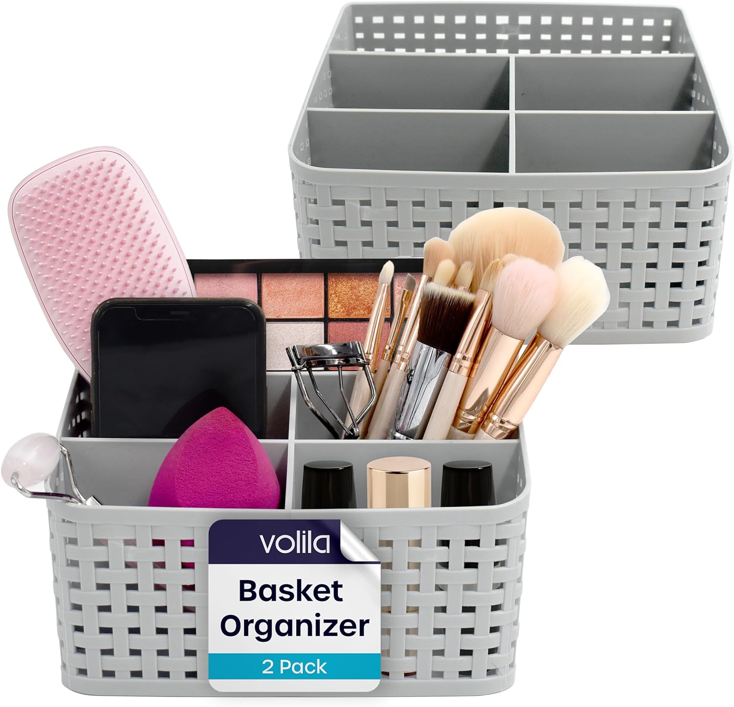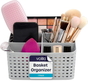 - The Cosmetics Basket Organiser has a layered design and consists of 5 compartments suitable for all your belongings, including your makeup brushes, creams, makeup, pens, pencils and other small items.