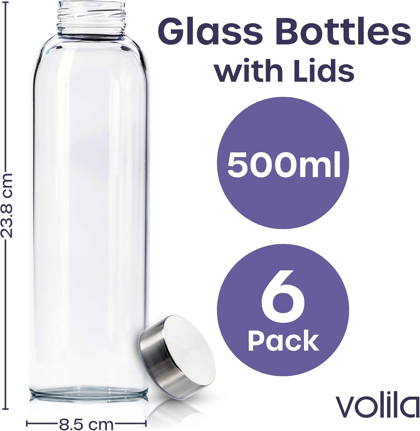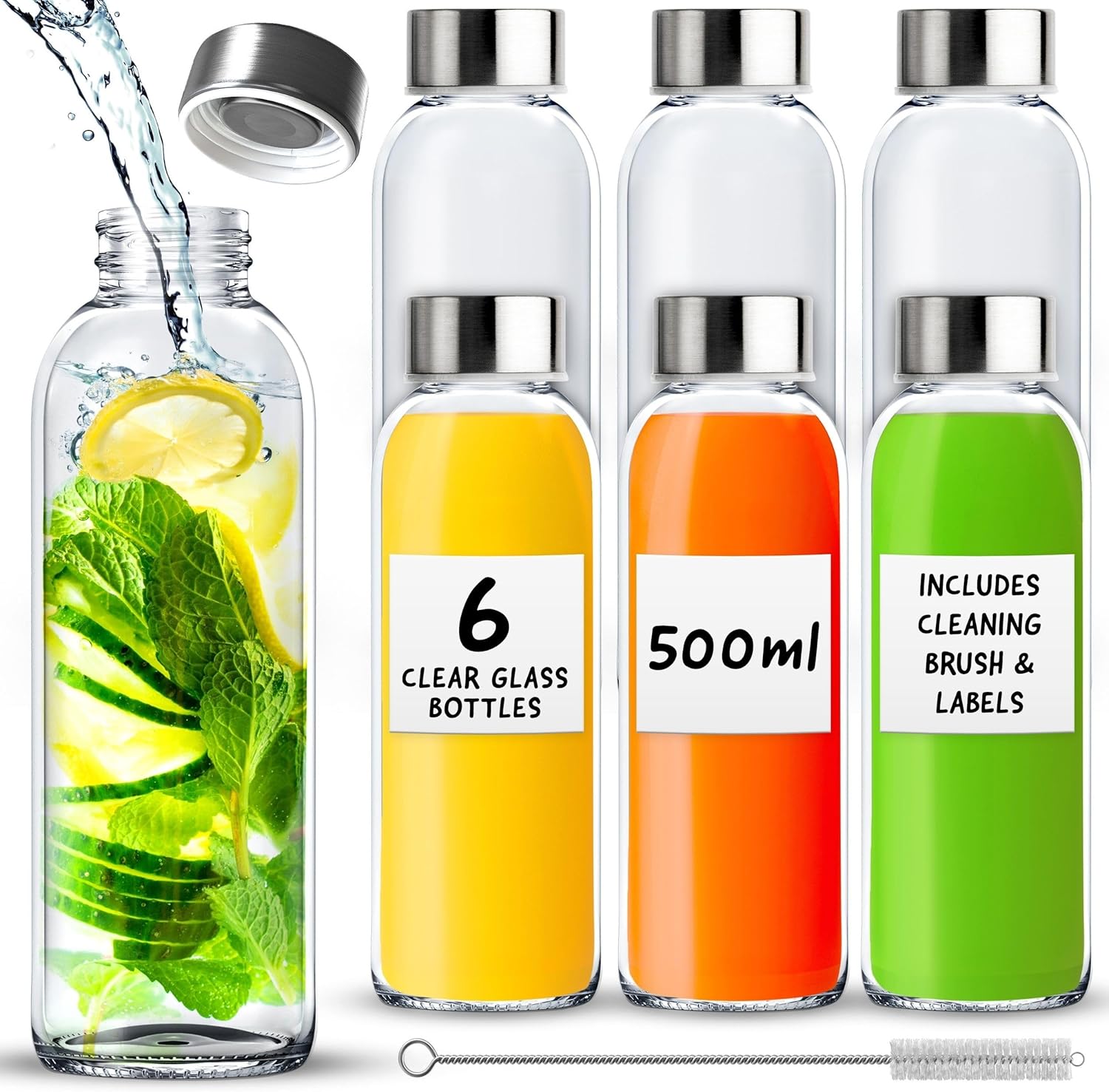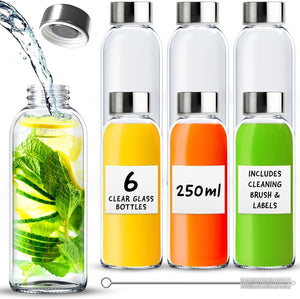 - 🥃【 Versatile 】 This set includes 6 pieces of 500ml (18oz) glass bottles with lids, ideal for a variety of beverages such as water, juice, milk, and smoothies. Suitable for use at home, work, during travel, and outdoor activities. The glass bottle measures 22cm in height, 6.5cm in width at the base, and 4.2cm at the top. The set also includes metal lids for each glass drinking bottle, a cleaning brush, and 6 white labels for easy organization.