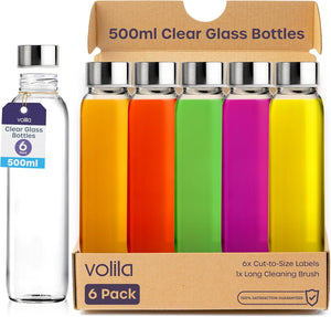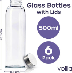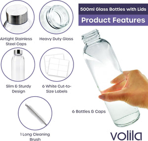 Glass Bottles with Lids 6 Pack 500ml Leakproof Glass Bottle for Water, Juice, Milk and Smoothie - Reusable Glass Drinking Bottle with Airtight Metal Lids, Cleaning Brush and White Labels