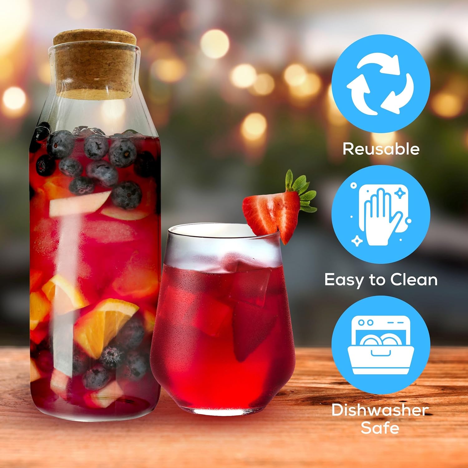 - π«γ WIDE RANGE OF USES γ Discover endless possibilities with our 1 litre glass bottle with cork beyond serving water, juices, cold brew bottle or storing milk, which keeps it fresh for longer. This versatile carafe with lid isn't just for beverages; it's perfect for detergent storage, fabric softener dispenser or even as a stylish storage bottle for your knick-knacks. Unleash your creativity with this multifunctional essential!