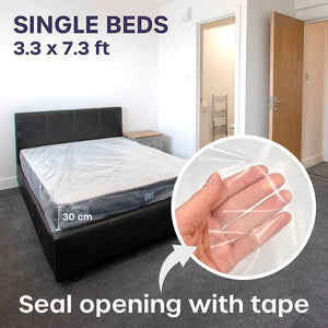 - Mattress bags are which is ideal for UK Sized Single Beds and are approx. 30cm wide (for thickness of the mattress). You can also put in a single bed in the mattress protector bag, however there will be more room and give.