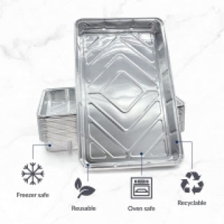 - 【LARGE DISPOSABLE TRAYS】The aluminum foil trays are large and the perfect size for baking, roasting or cooking in. They can be used to store food in the fridge or freezer, from putting your cookies into the pan or baking in them directly. The trays are long to make sure you can fit all your shapes of biscuits, cookies and shallow cakes in it.